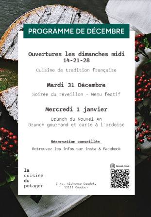 Pour le 31 décembre et le 1er janvier, La Cuisine du Potage vous propose un programme convivial et festif, pensé pour partager un moment agréable autour d’une cuisine généreuse et de saison.